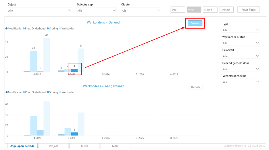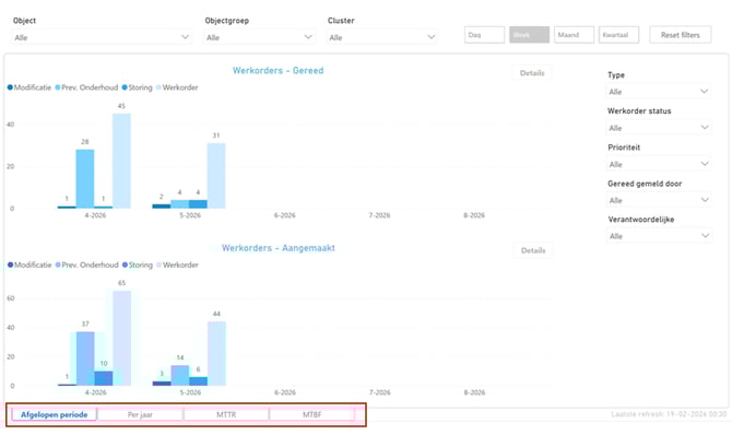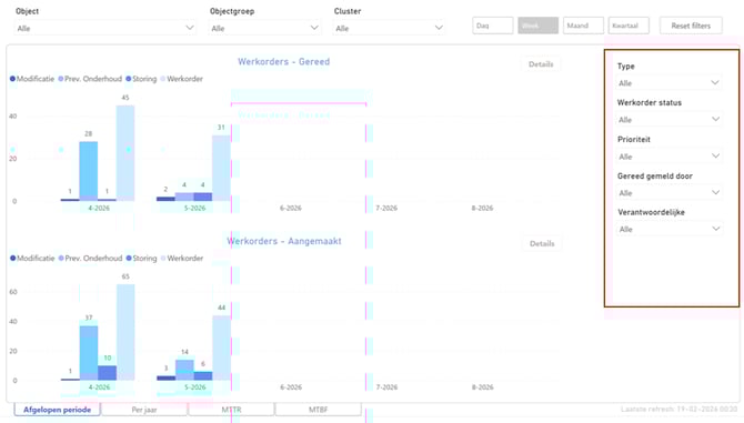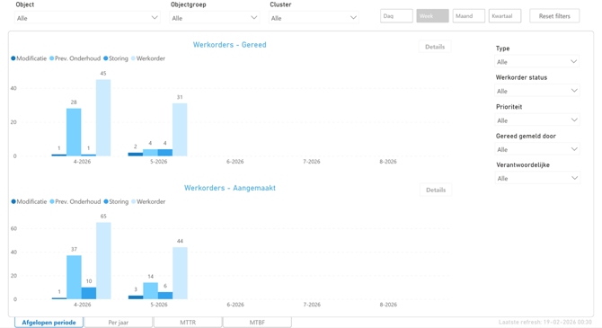 Deze laat het aantal werkorders zien die binnen een bepaalde tijdsperiode zijn gereed gemeld per werkorder type.