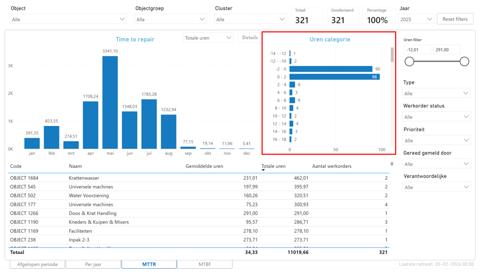 Wanneer een werkorder gereed gemeld wordt, dan worden deze uren opgeslagen, dit is de time to repair. De time to repair word getoond in aantal uren.