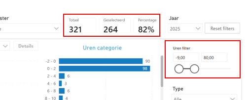 Bovenaan kan je zien hoe veel werkorders er uit gefilterd zijn. Je ziet het totaal aantal werkorders van dat jaar. Het aantal werkorders dat binnen de uren filter over blijft (geselecteerd). En het percentage geselecteerde werkorders.